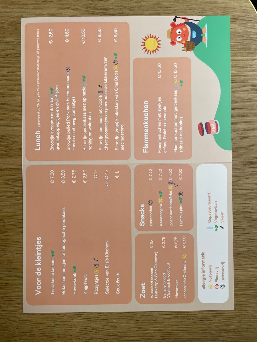 Voor de kleintjes (For the little ones): This section includes child-friendly choices such as cheese and tomato toasted sandwiches, simple buttered bread with jam or organic peanut butter, oatmeal cookies, squeezable fruit pouches, a selection of Ella's Kitchen products, raisins, and fresh fruit.
